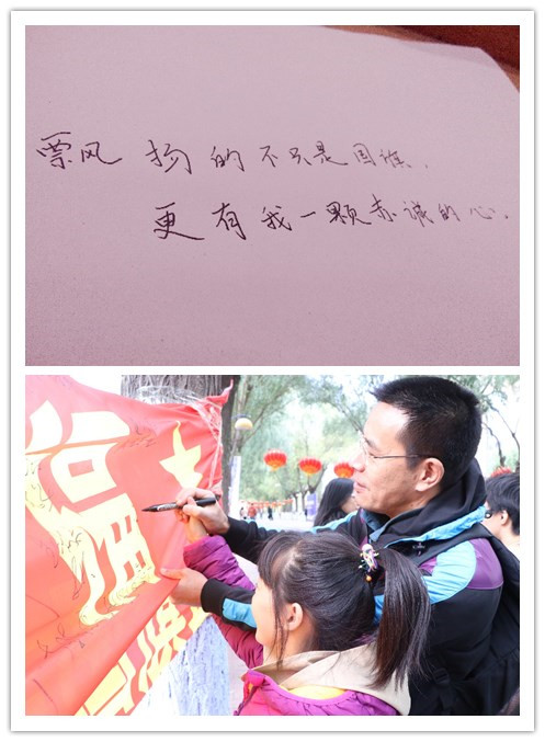 中午,国旗班举行了“我为祖国献祝福”的活动。活动在学苑楼餐厅前举行。四人着军装,护卫国旗。活动于11:45在学苑楼门前正式开始。风很大,但参与者热情不减。一开始,人员就络绎不绝。起先是本校的学生留下自己的签名,然后是教师,再后来食堂、保卫科的工作人员也都参与进来。参与者在横幅上签下自己的名字与对祖国的祝福,并与国旗合影。直到活动结束,签名处一直排着长队。一句一句诚挚的语言,都在表达着对祖国繁荣富强的期盼。四名国旗班同学在大风下军姿一直保持标准军姿,也让路人了伸出大拇指。