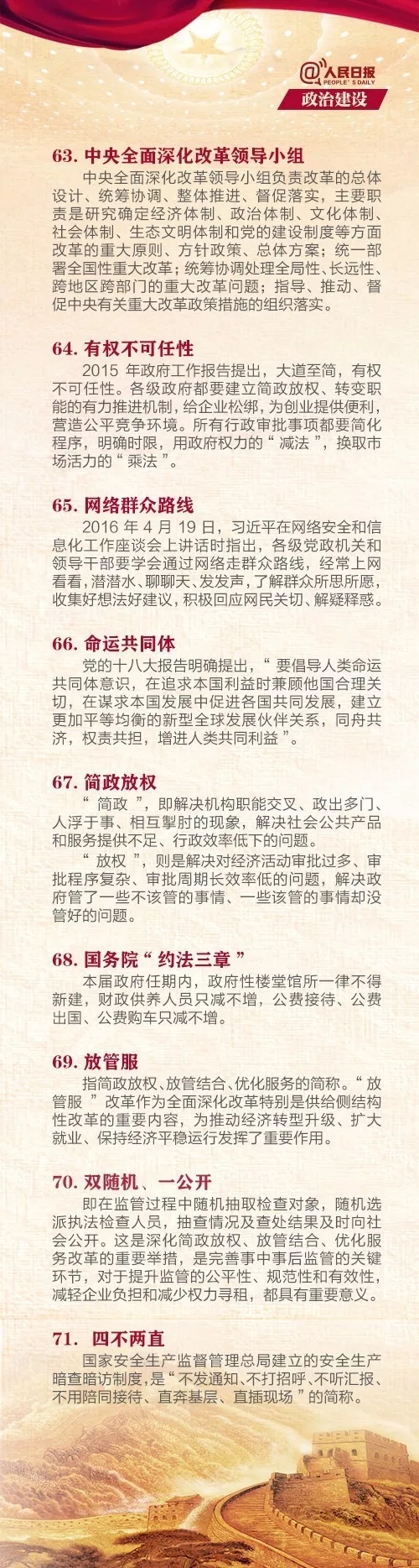 近日,为喜迎十九大的召开,人民日报、新华网、中国共产党新闻网、中国政府网整理了党中央治国理政的一百个新名词:“中国特色社会主义”、“两学一做”、“三严三实”、“四个全面”战略布局、“五大战区”、“分享经济”、“放管服”等最新名词解释应有尽有,600cc全讯白菜自助注册团委、学生骨干经过阅读和学习,向所有团员青年发出号召,在各团总支、团支部推广学习,希望团员青年积极学习、踏实认真、不忘初心、砥砺前行,争学榜样、争做榜样,以良好的理论基础、饱满的精神风貌迎接党的十九大。