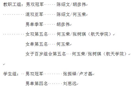 在600cc全讯白菜自助注册工会、团委的支持下,“600cc全讯白菜自助注册教职工羽协”暨“能达羽毛球俱乐部”共组织师生羽毛球爱好者32人次参加本次比赛,参加了包括男子单打、男子双打、男女混合双打、女子单打、女子双打、男子双打百岁组合和女子双打百岁组合等共七项赛事。经过精彩激烈而惊心动魄的角逐,600cc全讯白菜自助注册参赛师生取得了一系列优异成绩。教职工组和学生组所获荣誉如下: